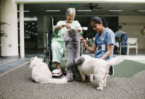 Since the animal-assisted therapy sessions started in early 2016, patients have been happier and more engaged, she added. They have also improved physically, such as by being able to stand for longer periods and balance better.