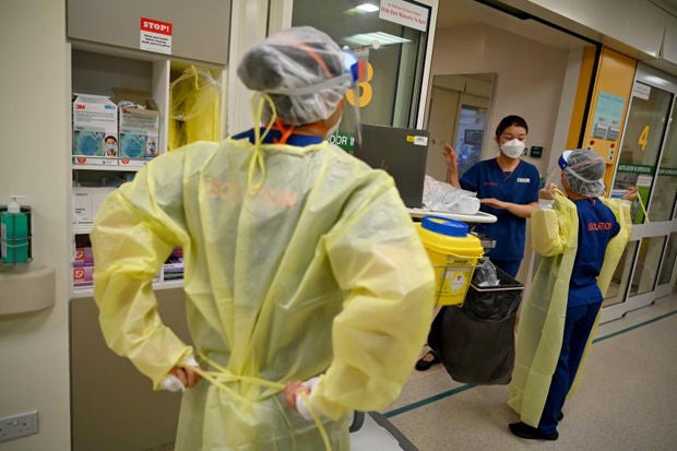 Medical staff donning protective equipment at a Singapore General Hospital isolation ward in November 2021. ST PHOTO: LIM YAOHUI