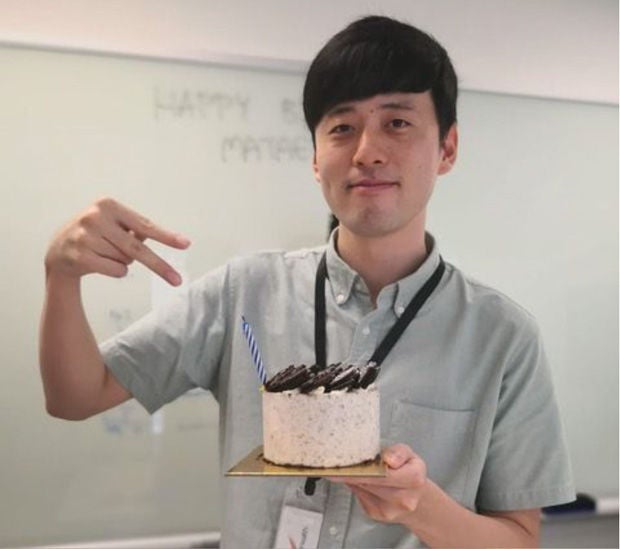 Surprised by his colleagues on his birthday, Dr Matae Ahn celebrates his special day in the lab