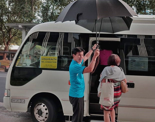 To shield them from the rain, Mr Fong alights with two wide-brimmed umbrellas, and stands between the bus shelter and bus door as they board. They remain dry while he gets wet from the spray.