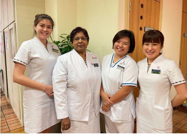 Sister Sara with the Breast Care Nursing team in SGH (from left) NC Krismaine Ng, Sister Sara, SSN Laura New and NC Bernice Yong)