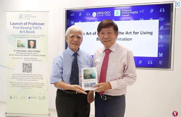 本地泌尿科之父胡强达(左)出书,通过个人的水彩和书法艺术作品,与年轻医者分享以人为先的行医理念。新报业媒体信托主席、前卫生部长许文远(右)为新书主持推介。(蔡家增摄)