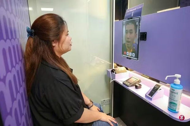 新加坡中央医院新开设的急诊部内远程看诊诊所,除了配有用于远程视频看诊的平板电脑大屏幕,也提供血压仪、温度计等让病患自己测量基本体征的仪器。(李姿仪摄)