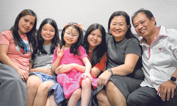 Nine-year-old Ng Hwee Suan (third from left), with her father Edwin Ng, mother Ivy Yeo, helper Lovelyne Ballogan, and elder sisters Ng Hwee Ling (second from left) and Ng Hwee Him, at home on Friday. Hwee Suan is only the second person here to have undergone an intestinal transplant. Her parents decided on the procedure, which was done on April 2, because of the amount of pain Hwee Suan had suffered in the past year. ST PHOTO: MARK CHEONG
