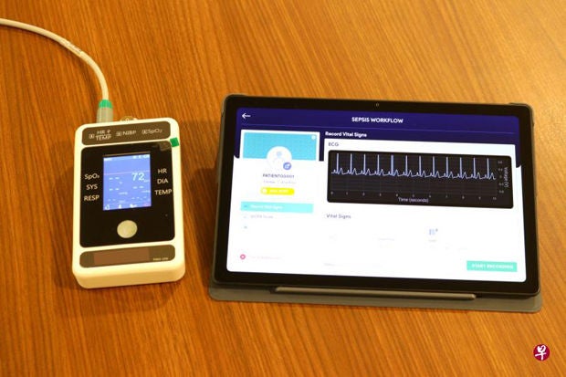 新加坡中央医院与杜克—国大医学院今年5月推出犹如手机般大小的仪器(左)以测量心率,把心率变异数据用于平板电脑内的新预算模式,可预测病患的败血症死亡风险。(新加坡中央医院提供)