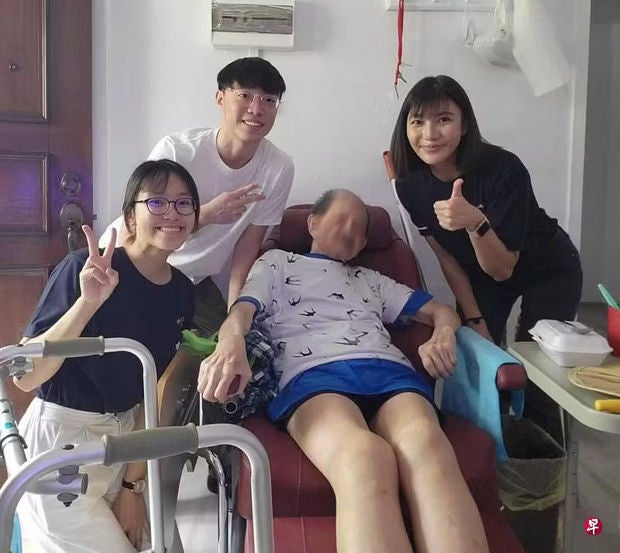 在TriGen计划下,临床专科护理师余诗敏(右一)和学生陈思卉(左一)与另四名小组成员,从2022年7月起经常探望独居的邱老伯。(受访者提供)