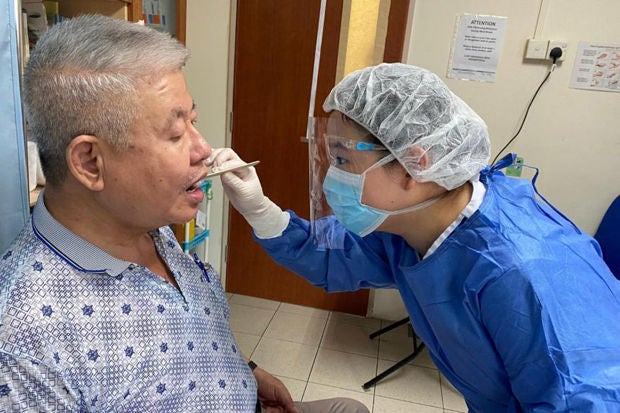 Senior Staff Nurse Peng Cheng Yu screening an elderly resident for oral frailty.PHOTO: SINGAPORE GENERAL HOSPITAL