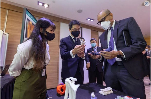 Senior Minister of State for Health Janil Puthucheary (right) looking at a 3D-printed educational aid at SGH's 3D printing centre. PHOTO:
