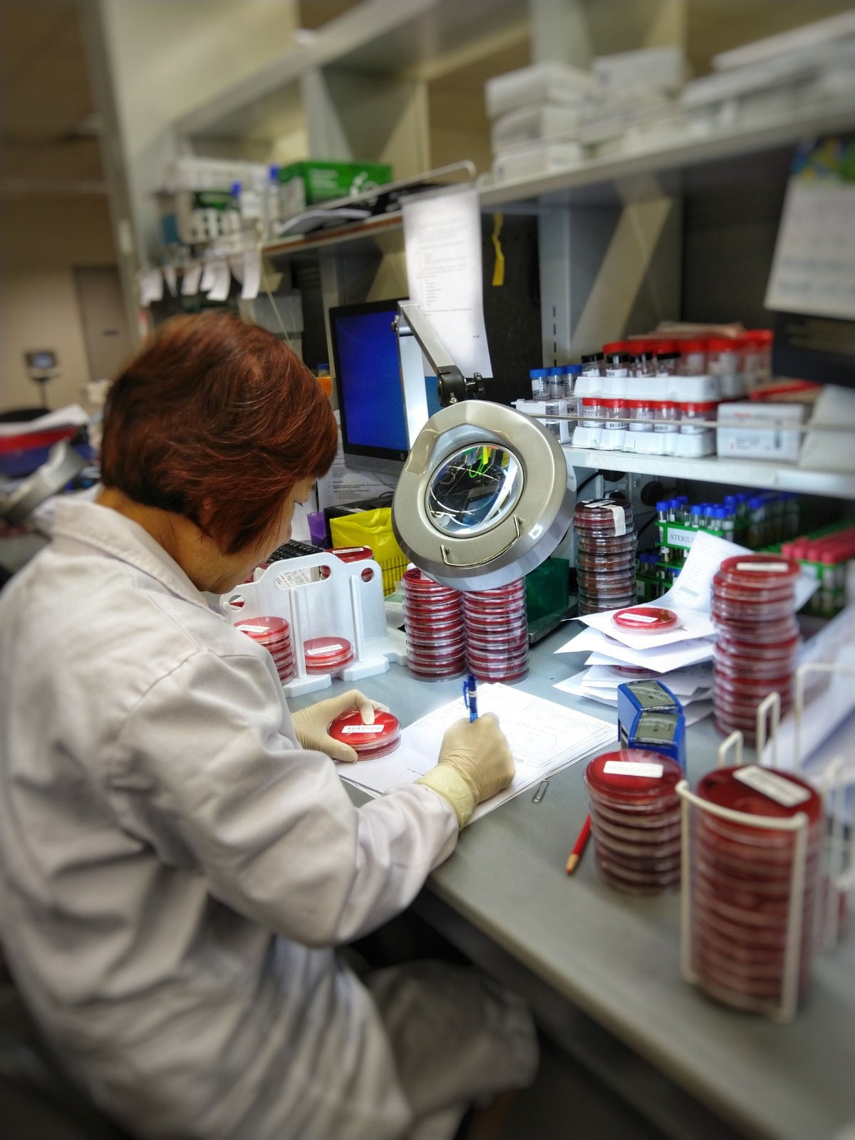 A senior staff in the microbiology lab examines the incubated plates with bacteria growth.