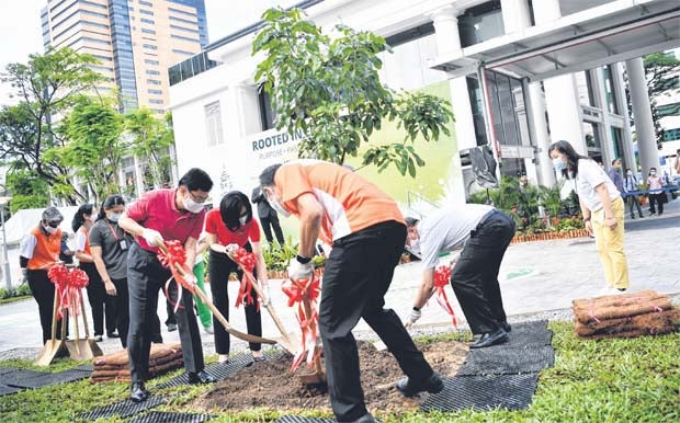(Clockwise from far left) Deputy Prime Minister, Heng Swee Keat and Mrs Heng, as well as Health Minister Gan Kim Yong and Singapore General Hospital chief executive Kenneth Kwek, planting a longan tree yesterday at the hospital’s new garden as it marks its 200th anniversary. ST PHOTO: ARIFFIN JAMAR