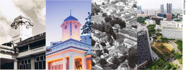 Sited around the Bras Basah and Stamford Road areas, the hospital was rebuilt and moved several times before eventually settling down in the Outram area. The SGH that started to bear some resemblance to the present complex can be traced to 1926, when three large building blocks were erected.