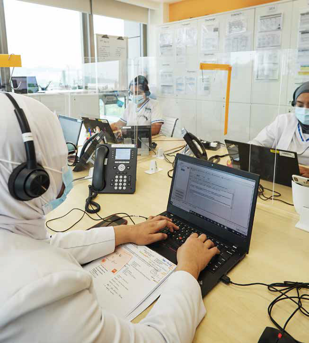 <<Just like a hospital ward round, the care team contacts patients (like this sample list shown on a large monitor) to assess their recovery and address their concerns.>>