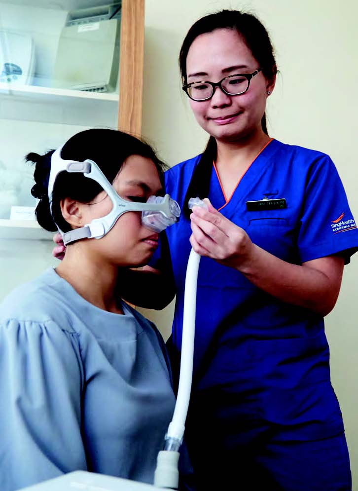 The most common conditions seen at the unit are sleep apnoea (interrupted breathing during sleep) and insomnia. For those with sleep apnoea, a device known as continuous positive airway pressure (CPAP) needs to be used during sleep. Ms Tay makes sure that patients get a well-fitting mask and that they understand how it is used.