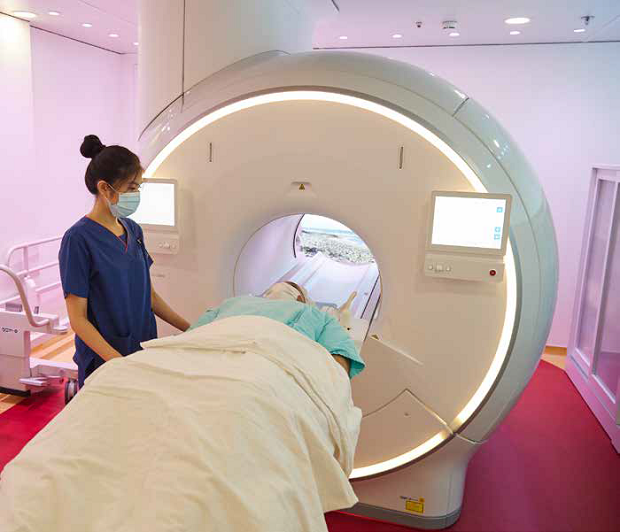 To address patient fears — a common issue — newer MRI machines have features to allay anxiety and claustrophobia. Patients with mild claustrophobia can have a mirror attached close to the face to reflect the view outside the bore instead of the tight space within. SGH’s newest MRI machine can create a relaxing atmosphere and the illusion of more space and light. Scenes of a beach, for instance, can be played, while the scanning room can be lit in the patient’s preferred colour or turned off.