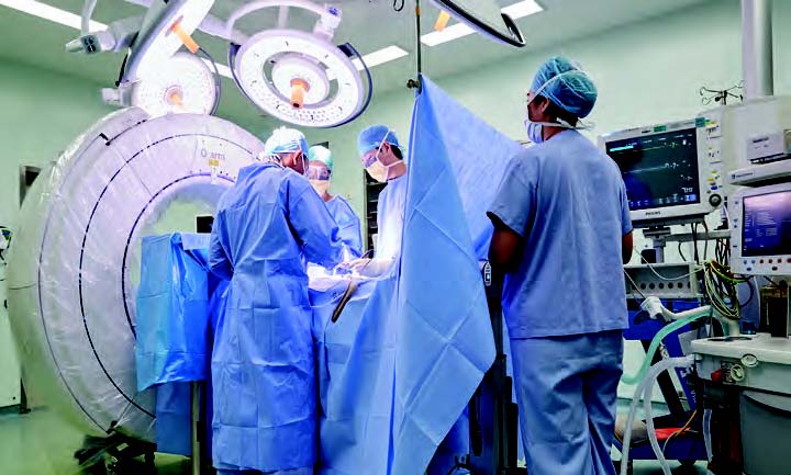 A mock-up of a spine procedure using an advanced imaging system, known as the O-arm, to guide surgeons.