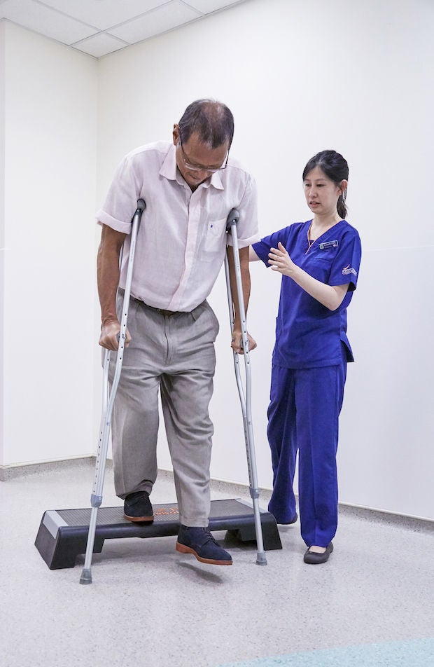 <<Mr Lionel Liew (above with Physiotherapist Eleanor Chew) underwent an enhanced recovery programme that enabled him to be discharged within 23 hours of his hip replacement surgery.>>