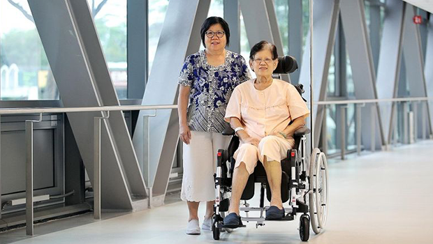 Retired cashier Tng Sai Choo chose to recuperate at the Outram Community Hospital (OCH) after her knee replacement surgery at Singapore General Hospital (SGH) last month, so that it is easier for her sister Thng Lay Choo (left) to visit her. They are at a linkway connecting OCH to SGH that allows for patient transfers. PHOTOS: LIANHE ZAOBAO